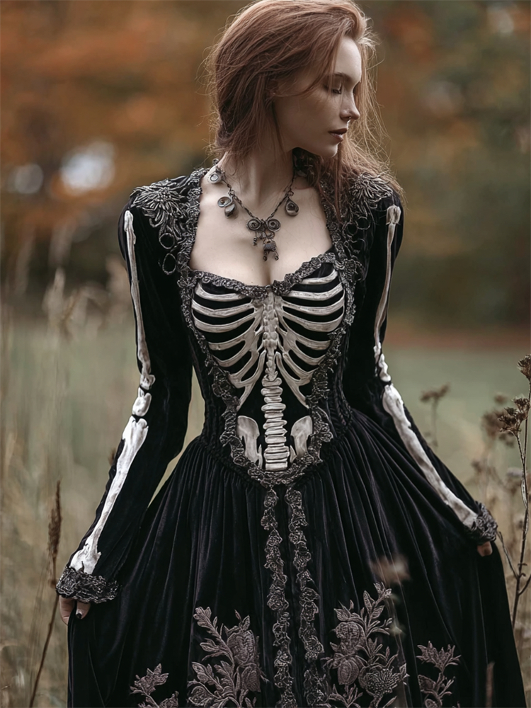 Vintage Classy Skeleton Floral Beaded Trim Velvet Maxi Dress